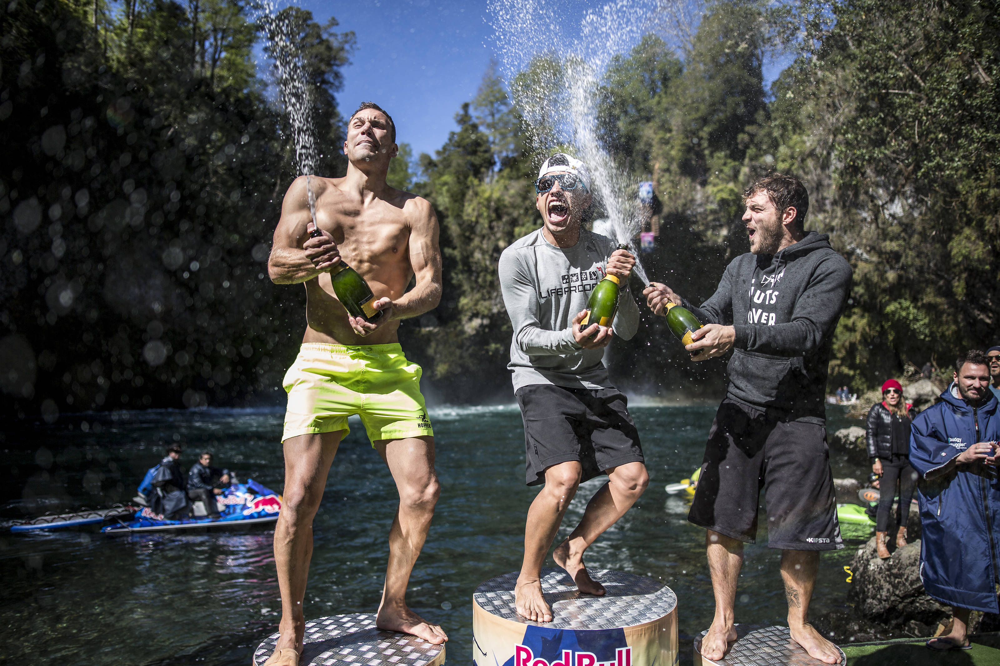 Michal Navratil of the Czech Republic, Jonathan Paredes of Mexico and Alessandro De Rose of Italy celebrate on the podium during the sixth and final stop of the Red Bull Cliff Diving World Series at Rininahue waterfall, Lago Ranco, Chile on October 21, 2017