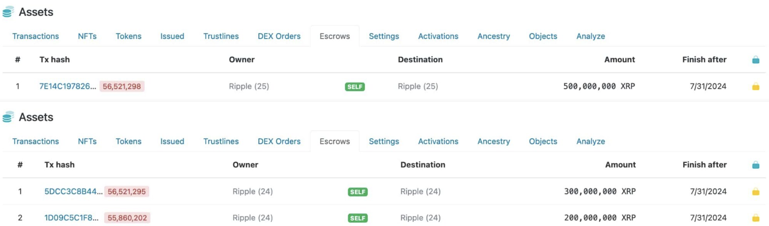 Според ончейн данни от XRPScan отключването ще се случи в сметките „ “ и „ “, с ескроу от надлежно 200 милиона, 300 милиона и 500 милиона XRP.