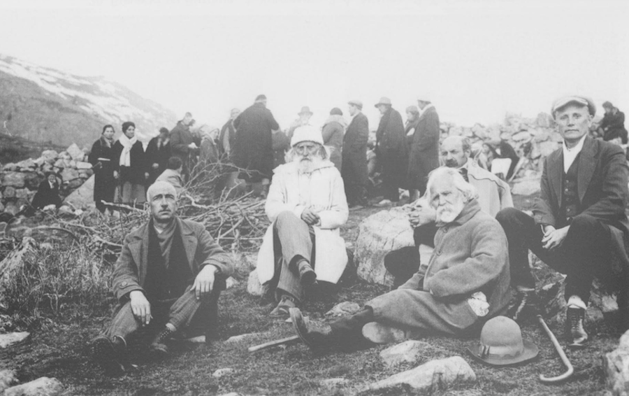 (Бивакът на Витоша. 1. Бертоли. 2. Учителят. 3. Дядо Благо. 4. Л. Лулчев (зад него). 5. Т. Стоименов)