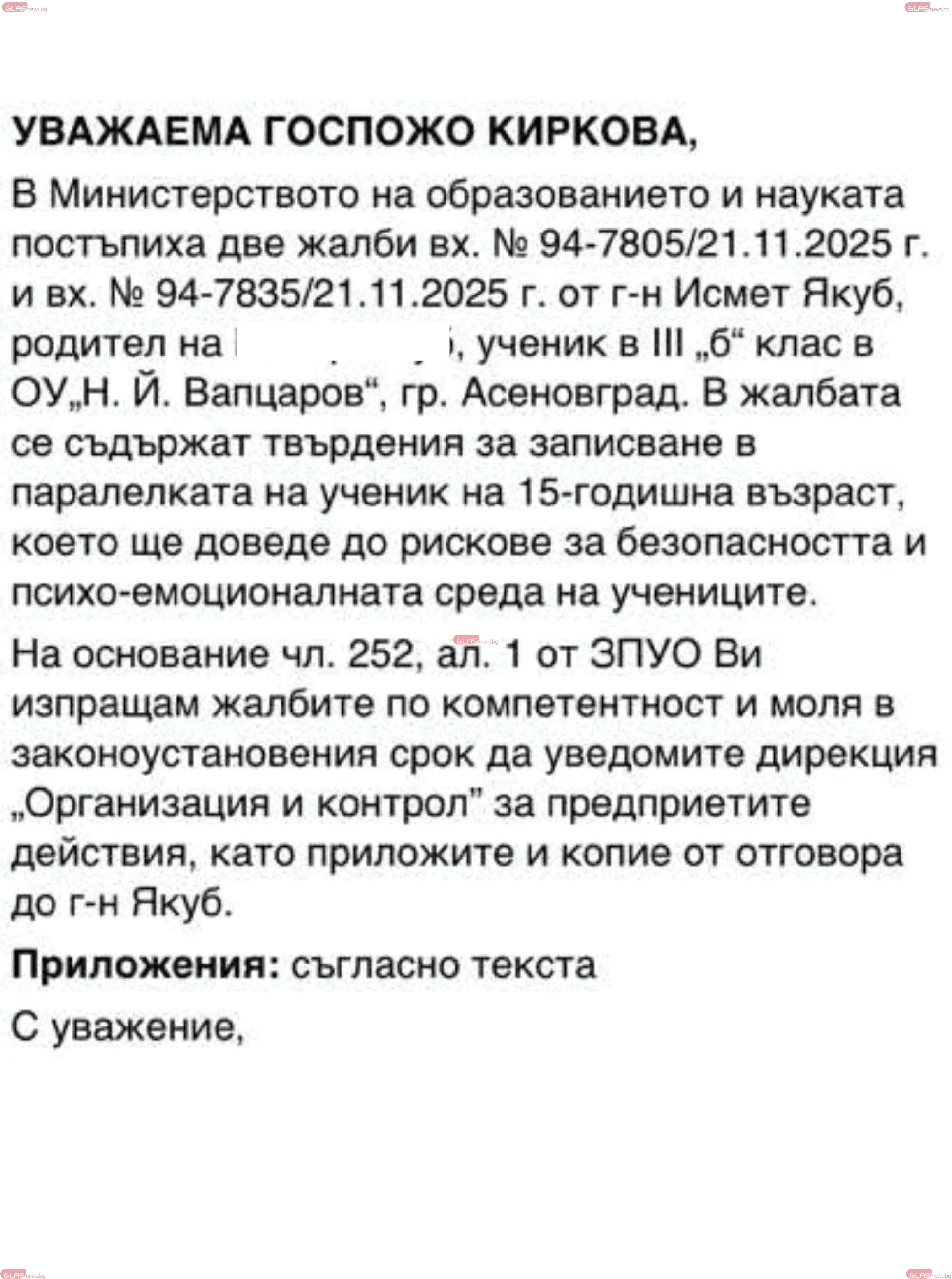 В писмо, изпратено до Якуб, което е подписано от заместващата директорката Мария Николова, обаче се акцентира, че досега няма никакви открити нарушавания, за които родителите настояват.