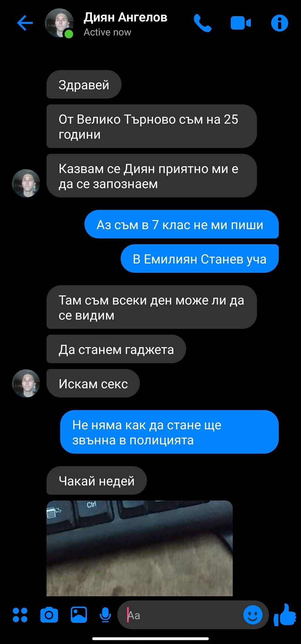 Родители от Велико Търново са обезпокоени за децата си. Майка е алармирала за млад мъж, за който твърди, че е педофил. По думите ѝ 25-годишния Диян Ангелов е писал известие на нейната щерка. Детето е в 7 клас. Въпросният юноша е предложил секс на момичето, изпращал е и негови голи фотоси.