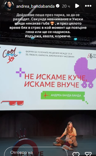 По време на присъединяване си в семинара за житейските решения сред 25 и 35 години тя споделя по какъв начин грижата за домашния любим ѝ е помогнала да усети отговорността, ритъма и смяната в всекидневието, които идват с това да се грижиш за друго създание. Андреа споделя, че страхът от неточности, публичният напън и упованията от близките постоянно вършат тематиката за децата тежка, изключително за хората в по-динамична среда. Затова тя е избрала първо „ образователната версия “ – кучето, което я учи на самообладание, рутина и прочувствена резистентност. И макар шегите на родителите ѝ, тя има вяра, че всяко огромно решение би трябвало да идва в точния миг – не по напън, а по избор.