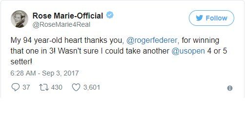 " Моето 94-годишно сърце ти благодари, Роджър Федерер, че завоюва дуела в 3 сета. Не съм сигурна, че щях да устоя още един твой дуел на US Open в 4 или 5 сета ", написа Роуз Мари в формалния си акаут в " Туитър ".