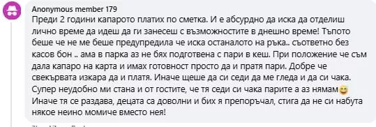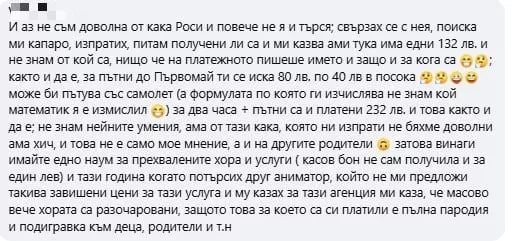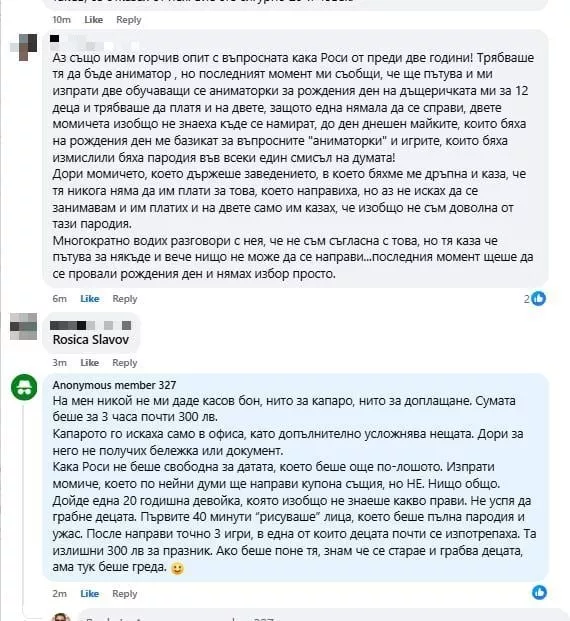 Друг родител споделя, че е платил 300 лева за три часа, без да получи касов бон или какъвто и да е документ. Вместо „ кака Роси “, пристигнало друго момиче, което „ седна с гостите, хапна сладкиши и не направи безусловно нищо “.