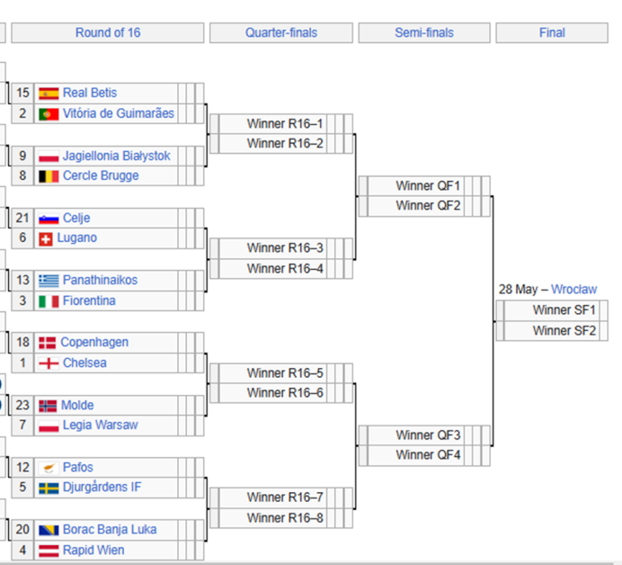 В Лигата на конференциите най-интересният конфликт ще е сред Панатинайкос и Фиорентина, любимецът за трофея Челси ще има тежък конфликт с датския ФК Копенхаген, а Бетис ще се изправи против португалския Витория Гимараеш.