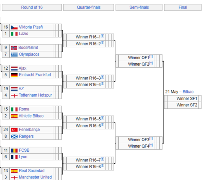 Рома - Атлетик Билбао е най-интересният осминафинал в Лига Европа. Манчестър Юнайтед ще се изправи против Реал Сосиедад, а Тотнъм се изправя против АЗ Алкмаар.