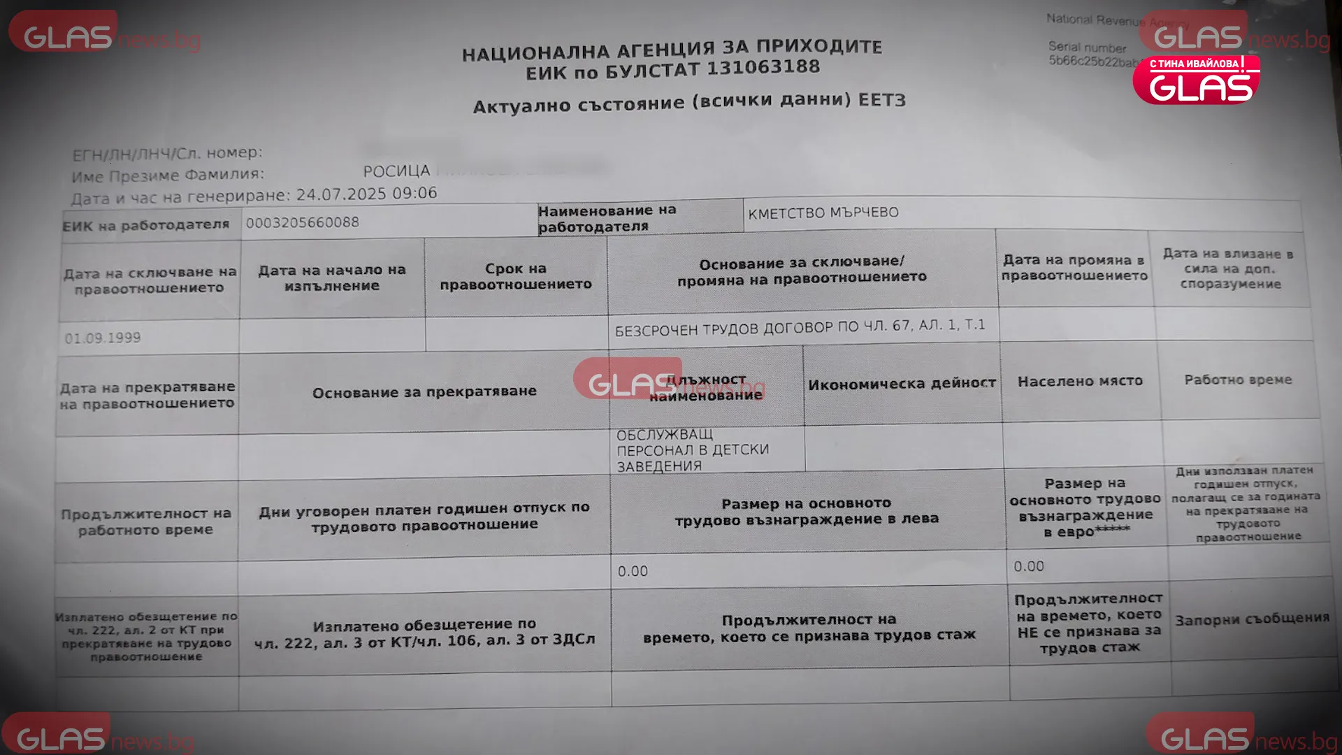 -- Росица С.: Не. Говорих единствено с кмета на село Марчево. Той е в отпуск сега, само че ми сподели, че когато се върне (на 11 август), ще отидем дружно в Инспекцията по труда и в Национална агенция за приходите. Твърди, че ще оправим нещата, като се „ изтрият “ данните. Справката от Национална агенция за приходите обаче демонстрира, че имам неопределен трудов контракт по член 67, алинея 1, точка 1. Не е посочено трудовото заплащане, нито са попълнени данни в трудовата ми брошура.