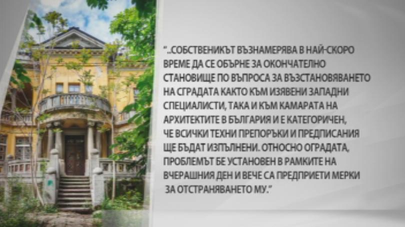 Собственикът Валентин Златев изясни, че са подхванати ограничения след разрухата и удостовери, че има желание да ремонтира къщата. Експерти обаче считат, че постройката е прекомерно остаряла, строена със остарели материали и ще е доста мъчно да се възвърне.