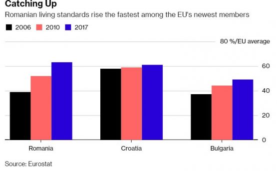 Откакто се причисли към Европейски Съюз, Румъния най-бързо догонва по-богатите страни. Тя удвои своя Брутният вътрешен продукт на глава от населението до 60% % от междинния за Европейски Съюз тази година, сподели Исъреску. Макар България да стартира от към 30 % от междинния, тя напредва по-бавно и ще реализира единствено към половината от Брутният вътрешен продукт на глава от популацията на Европейски Съюз, добави той.