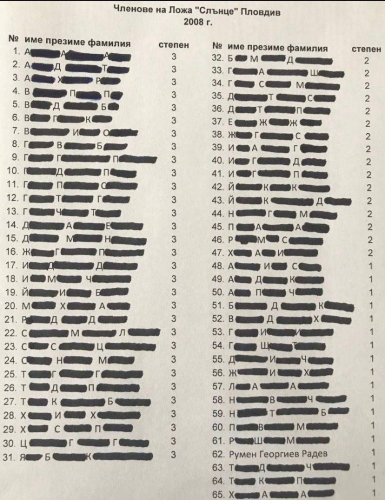 Срещу името на Радев е изписана и цифрата 1, което е степента, която има съотвения масон. В случая с президентът той е „ чирак “. Три значи " занаятчия ", с две са удостоени " калфите ".