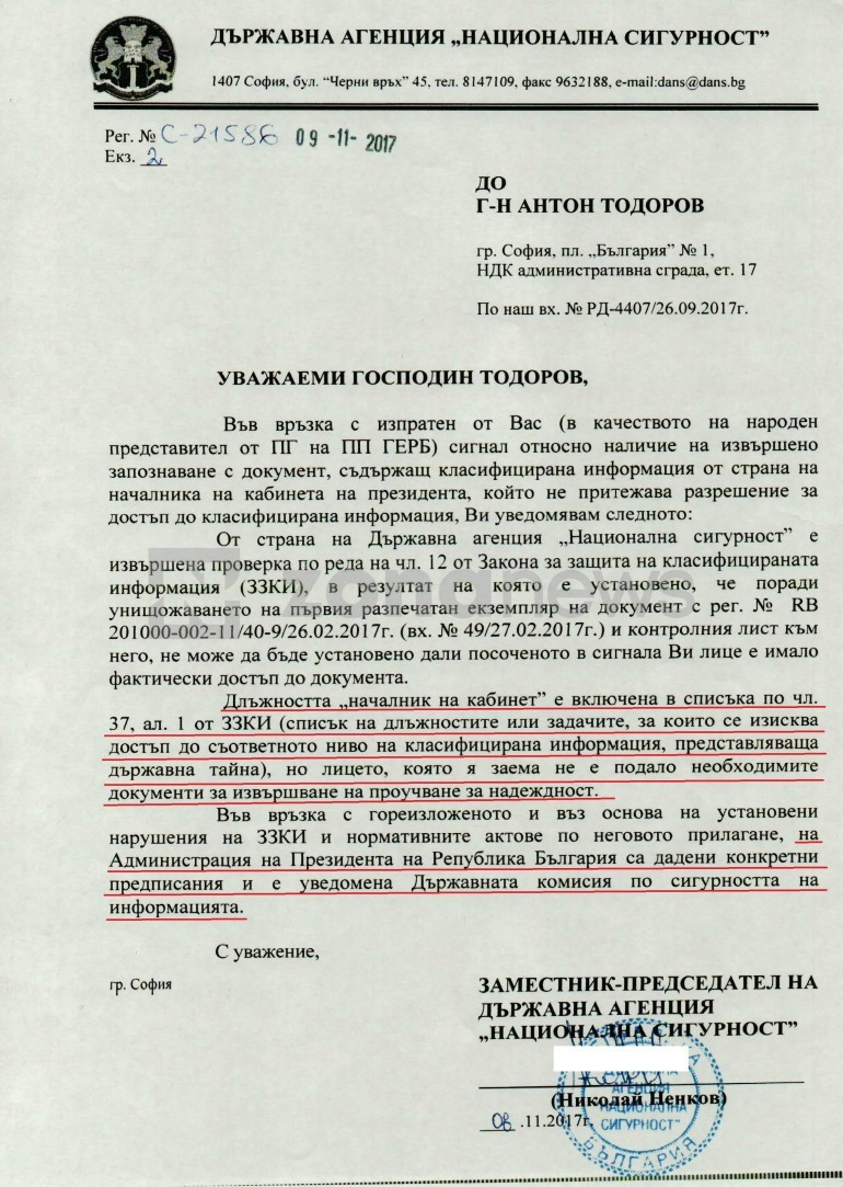 Румен Радев споделил преди час, че щял да търси отговорност от Борисов за какво службите давали допуск до класифицирана информация на проблематични хора. Както и за шпионските кавги. Това е нечувана и невиждана низост " Румен Радев стайл ", безсрамие и безсрамие на N-та степен! Лицето Радев би трябвало да бъде разобличено неотложно. Кога ще му се потърси отговорност, че повече от година началникът на неговия кабинет Иво Христов нямаше допуск до класифицирана информация. Много абсурден факт, само че тихомълком беше заметен под килима преди няколко години. Аз обаче, както добре знаете, вардя всичко значимо за последните 30 години в архива си. Ето един документ от ДАНС, от който ясно се вижда, че Държавна организация " Национална сигурност " ме уведомява на 8 ноември 2017 година за следното: " Длъжността " шеф на кабинет " е включена в листата по член 37, ал.1 от Закона за отбрана на класифицираната информация (списък на длъжностите или дилемите, за които се изисква достъп до съответното равнище на класифицирана информация, представляваща държавна тайна), само че лицето, което я заема (Иво Христов към ноември 2017 г.) не е подало нужните документи за осъществяване на изследване за надеждност. Във връзка с гореизложеното и ВЪЗ ОСНОВА НА УСТАНОВЕНИ НАРУШЕНИЯ на Закона за отбрана на класифицираната информация и нормативните актове по неговото използване, на Администрация на Президента на Република България са дадени съответни наставления и е известена ДКСИ ". Край на цитата! Проверете какви ги говореше тогава Румен Радев - че нямало никаква потребност Иво Христов да има допуск, че не бил нарушен закона за класифицирана информация, че аз съм бил политически нарушител и така нататък Върнете изказванията на Българска социалистическа партия и Корнелия Нинова от това време, когато разкрих, че ДАНС ревизират администрацията на президента поради приключване на класифицирана информация и сравнете с днешните кавги по тази тематика. Филип Попов и други видове от Българска социалистическа партия дори призоваваха прокуратурата да ме проверява поради разгласяването на тази интервенция на ДАНС в президентството. Направил съм го преди цели четири години. За някои неща е значимо освен какво правиш, само че и по кое време го правиш. Нека обобщя - разкритията ми за Румен Радев и " Грипен ", разкритията ми за Иво Христов и неговия татко от Разузнавателно управление на Министерството на нар, някогашен резидент на комунистическото военно разузнаване в Брюксел 1984-88 година, където е работил против НАТО, разкритията ми, че полк. Христо Христов (бащата на Иво Христов) е бил два пъти на особено образование в ГРУ в Москва - на 10-месечна школа и на специфична 2-месечна такава за управителни фрагменти, разкритията ми за още няколко грандиозни абсурда през 2017 година бяха в основата на нечуваната и невиждана оплювателска акция, която се поде против мен след 19 май 2017 година, когато накарах с първото си изявление като депутат антибългарската тайфа Българска социалистическа партия да напусне залата на Народно събрание. Московските паразити в България в никакъв случай не ми го простиха и няма да ми го простят. Аз на тях - също.
