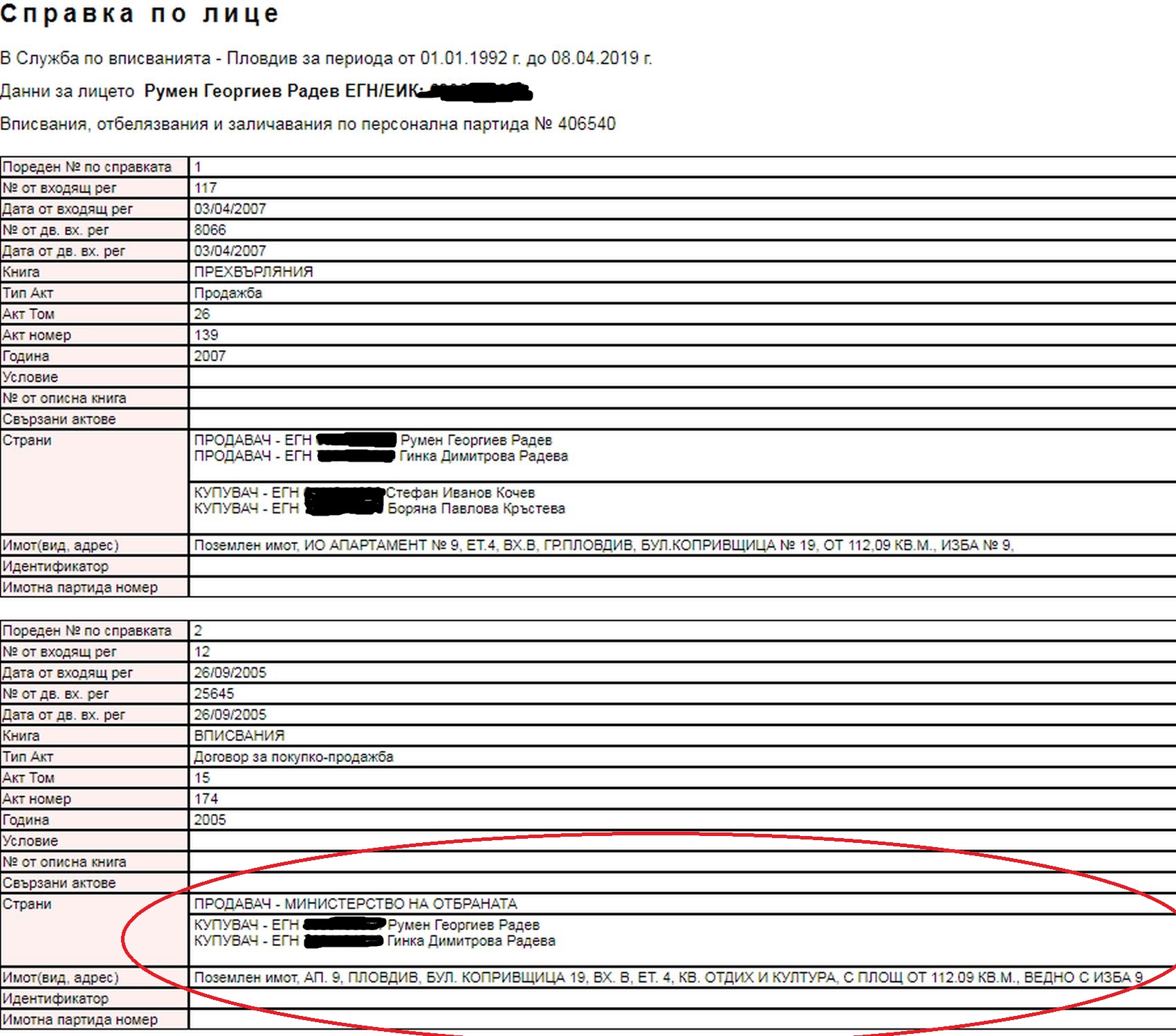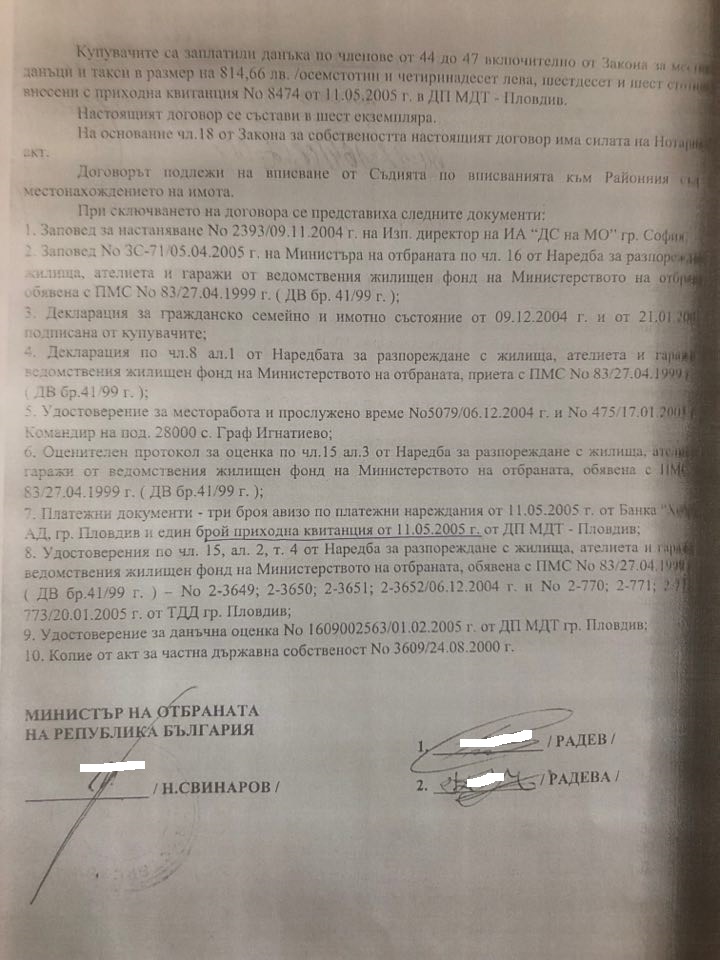 Радев и тогавашната му брачна половинка Гинка получават жилището като " нуждаещи се ". Веднага след придобиването му обаче те вършат странна врътка - пускат в жилището майстори, които правят ремонт. В това време, в нарушаване на закона, употребяват чартърен второ ведомствено жилище от фонда на Министерство на защитата.