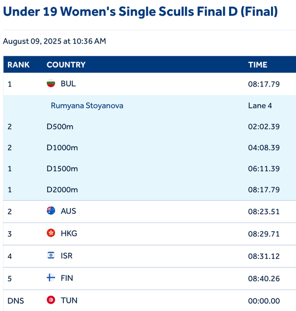 Румяна Стоянова завоюва първото място във Финал D в дисциплината скиф, откакто измина дистанцията от 2000 метра за 8:17:79 минути.