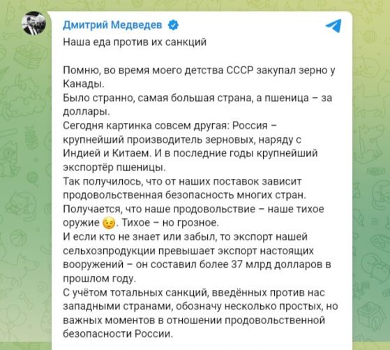 Само месец след началото на войната някогашният президент на Русия Дмитрий Медведев назова износа на храни “тихото оръжие ”. В профила си в Телеграм той: