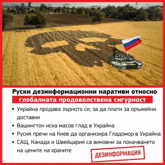 В пропагандната реторика на проруските медии, Русия е тази, която ще попречи на Киев да “възкреси ” Гладомора в Украйна. Именно по тази причина съветските елементи блокират пристанищата и не разрешават жизненоважното за украинското население зърно да бъде изнесено. Целта е нападателната политика на Кремъл да се показа в нова, хуманна светлина пред света: Русия не се грижи единствено за рускоезичното население в региона, а поема ролята на повсеместен покровител. А персонално Путин е показан като великодушния избавител.