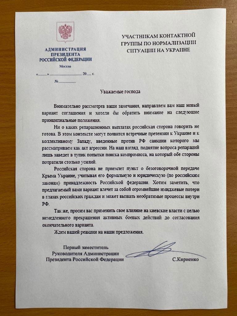 Предложението, което е на бланка на администрацията на Кремъл и носи подписа на нейния заместник-началник Сергей Кириенко, е адресирано до „ членовете на контактната група по нормализация на обстановката в Украйна “.