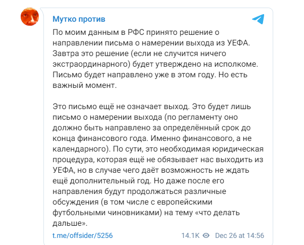Информацията е на телеграм-канала „ Мутко срещу “, който се базира на източник, участвал на днешното съвещание на Изпълкома на РФС. Счита се, че писмото до УЕФА ще бъде изпратено до края на годината.