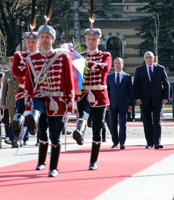 Борисов посрещна Медведев на публична гала на пл. „ Св. Александър Невски “.