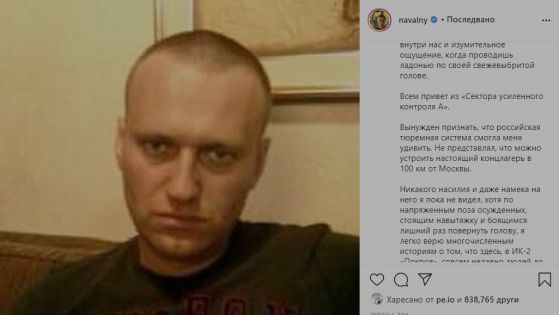 В известието, качено в Инстаграм, има и фотография на Навални. На нея той е с обръсната глава, само че е от преди години. Навални споделя, че за него е необикновено чувство да прокара ръката си по преди малко избръсната си глава. Освен това той споделя, че продължава да го изненадва и осеяното със звезди небе, което вижда от наказателната колония.