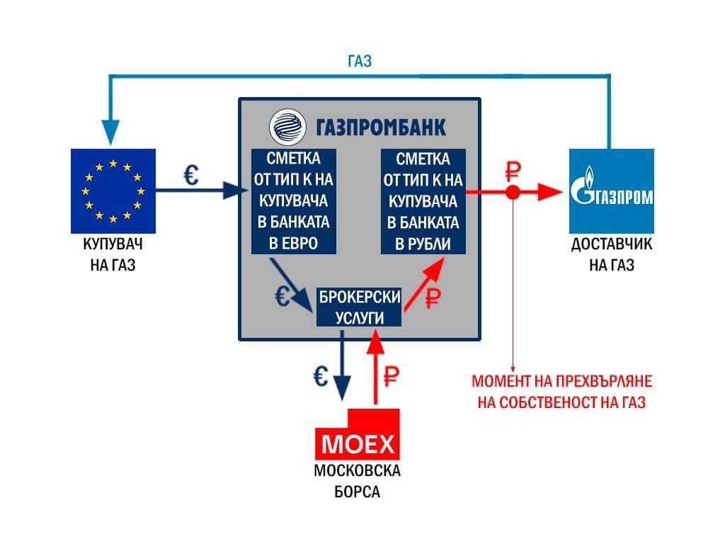 Алгоритмът допуска прекачване на сумата, посочена в контракта. В „ Газпромбанк “ задгранични купувачи откриват специфични сметки във валута и в рубли. Купувач заплаща за газа с валута. След това „ Газпромбанк “ продава валутата на Московската борса и трансферира рублите на втората сметка на купувача за по-нататъшно извършване на отговорностите към „ Газпром износ “. След това се прави снабдяване на газ.