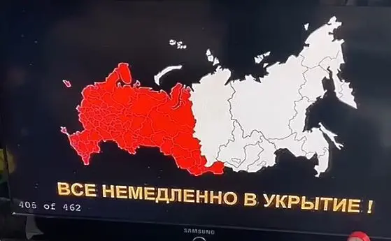 На тези, които гледаха по малкия екран, беше показана карта на Русия, която постепенно се покриваше в алено от запад на изток, до момента в който звукът на сирената за въздушна офанзива се чуваше от високоговорителите им.