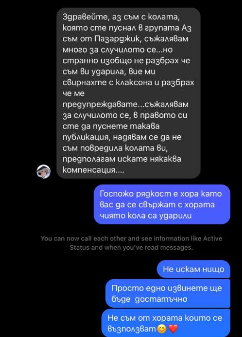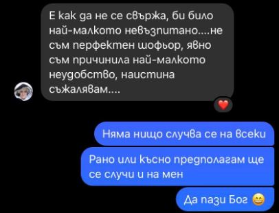 Рядко срещана преживелица се е разиграла в Пазарджик. След като кола, по нехайство и без лидера да разбере, леко е блъснала друга, двете страни се схванаха спокойно и с голяма доза съгласие. След като млад мъж разгласява в мрежата, че е бил блъснат от шофьорка, тя незабавно се свързва с него, с цел да се схванат. В хода на диалога им излиза наяве, че едно опрощение и предпочитание за вдишване на отговорност, са изцяло задоволителни.