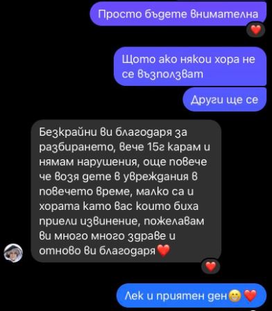 „ Ако повече хора знаеха, за какво заплащат гражданска отговорност, нямаше да бягат. На всеки може да се случи, изключително на нас дамите. Нищо не пречи човек да си остави номера на чистачките, и да се свържат с него. После ще попълнят протокол, и ще се поемат разноските по вредите на потърпевшия. Нека бъдем на първо място хора. “