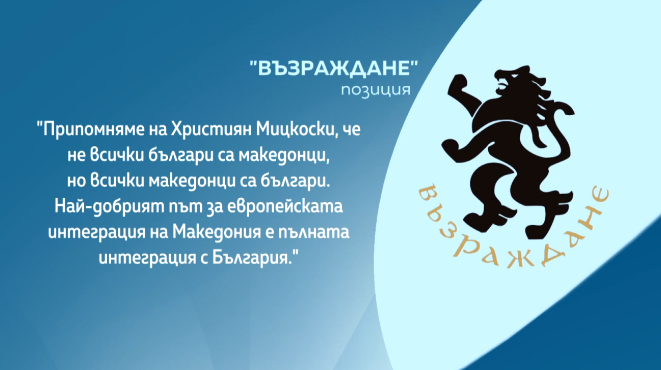 Позицията на „ Възраждане ” към Мицкоски – „ не всички българи са македонци, само че всички македонци са българи ”. „ Припомняме на Християн Мицкоски, че не всички българи са македонци, само че всички македонци са българи. Най-добрият път за европейската интеграция на Македония е цялостната интеграция с България ”, декларират от партията.