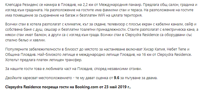 В уеб страниците за резервации, хотел " Клепсидра ", ситуиран на Сахат тепе, и по-точно на ул. Божидар Здравков " 9, се популяризира като настоящ обект, в който хората отсядат.