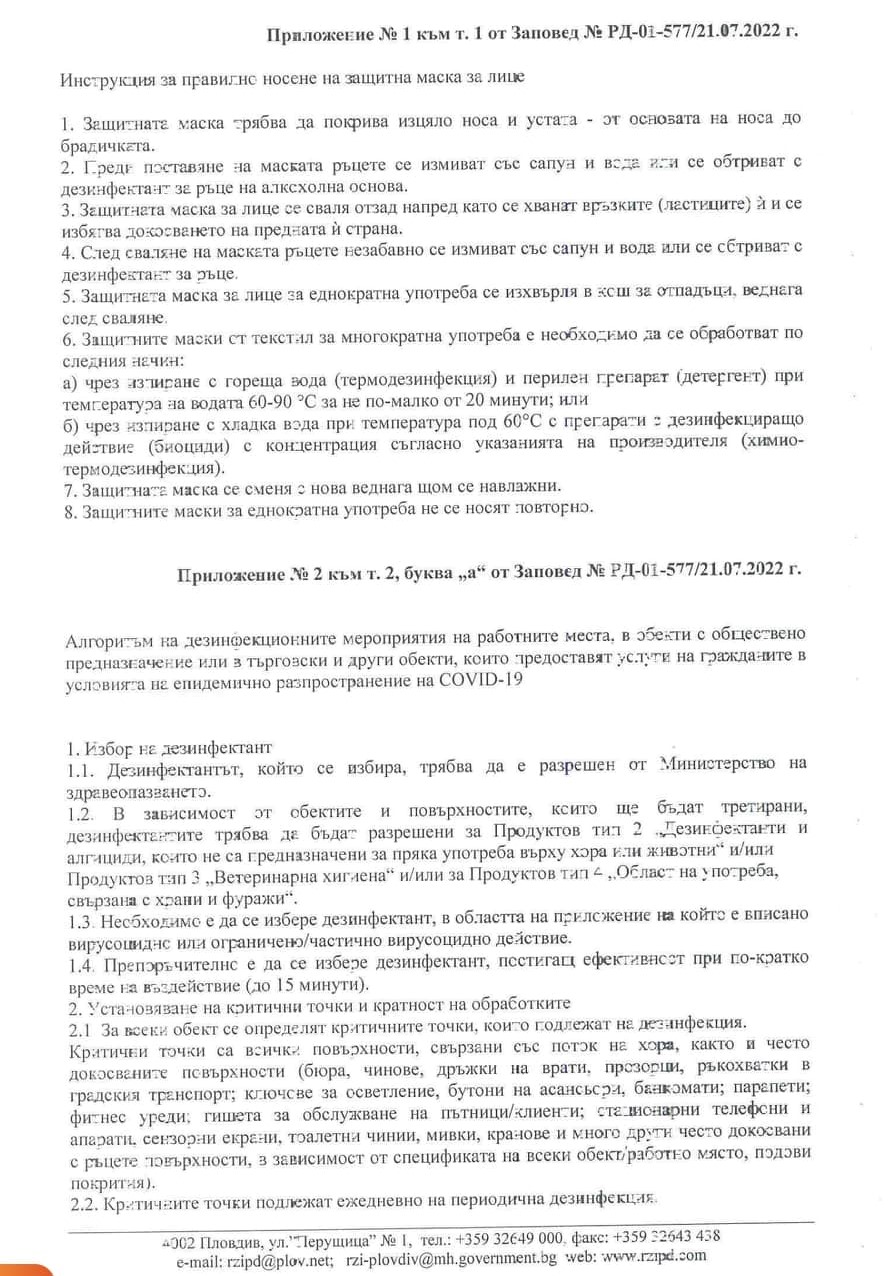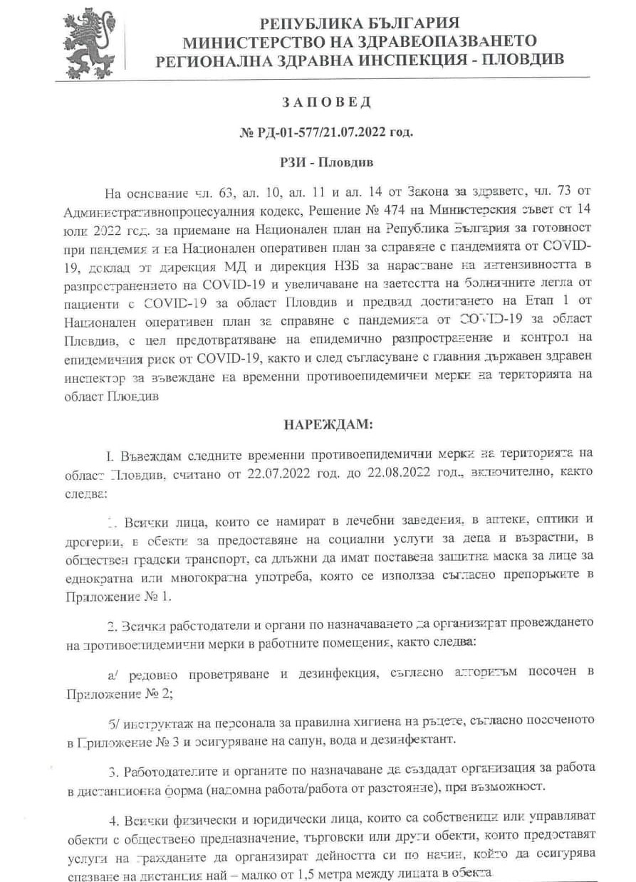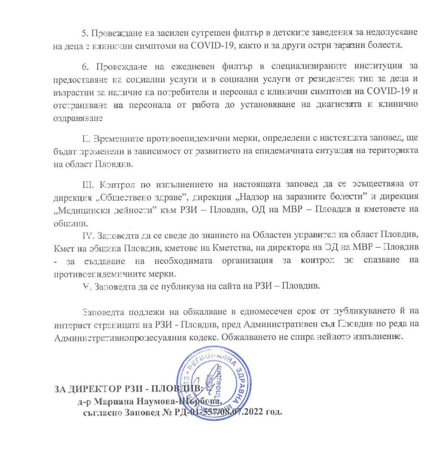 РЗИ вкарва нови противоепидемични за Пловдив от на следващия ден до 22 август 2022 година.