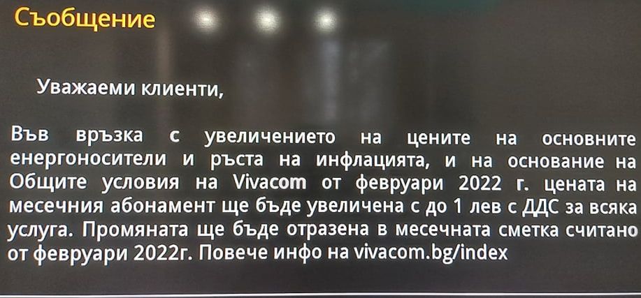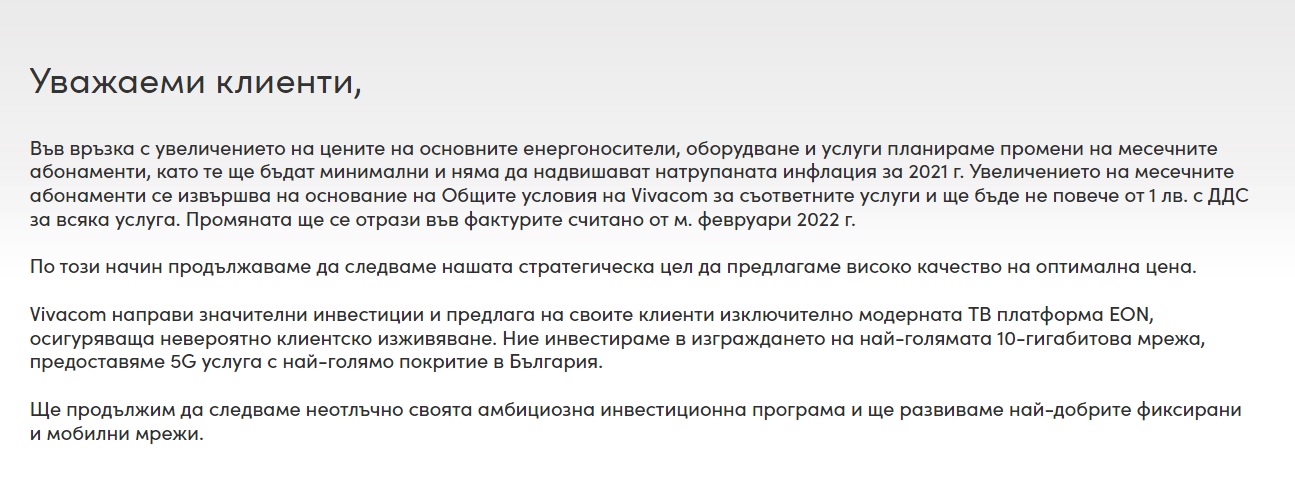 На уеб страницата на Виваком също има известие, което гласи: " Във връзка с нарастването на цените на главните енергоносители, съоръжение и услуги планираме промени на месечните абонаменти, като те ще бъдат минимални и няма да надвишават насъбраната инфлация за 2021 година Увеличението на месечните абонаменти се прави на съображение на Общите условия на Vivacom за съответните услуги и ще бъде не повече от 1 лева с Данък добавена стойност за всяка услуга. Промяната ще се отрази във фактурите считано от м. февруари 2022 година