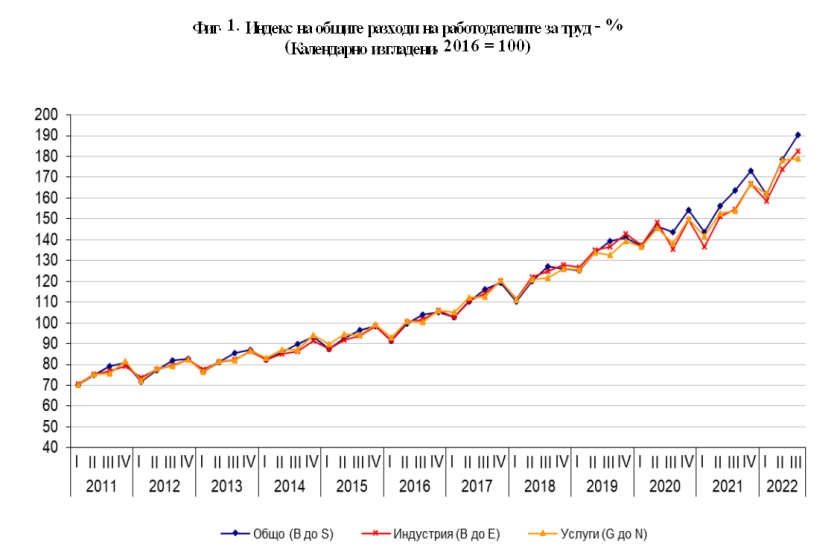 През третото тримесечие на 2022 година по отношение на третото тримесечие на 2021 година разноските за заплащане за един отработен час се усилват с 16.3%, а другите разноски (извън тези за възнаграждения) - с 15.8%.