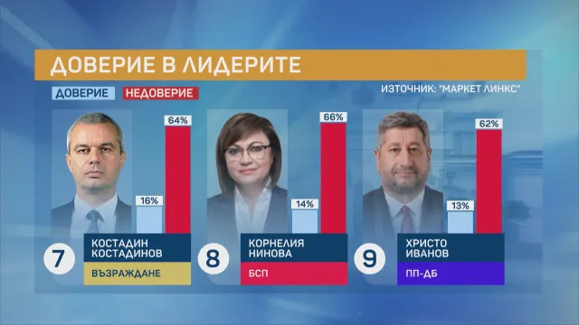 След Кирил Петков виждаме в подредбата водачът на " Възраждане " Костадин Костадинов, следван от Корнелия Нинова и Христо Иванов.