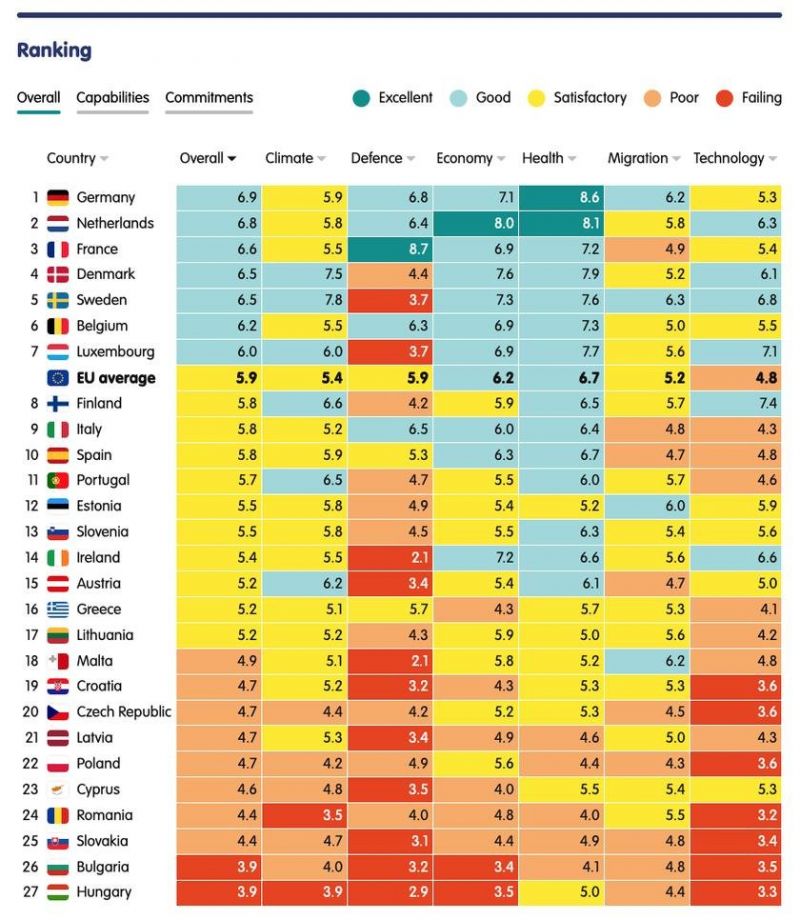Най-ниският индикатор на България е в областта на защитата – 3.2, стопанската система ни е на 3.4, 3.5 са технологиите. Напълно суверенни страни няма и това го демонстрират резултатите на първата в класацията – Германия, която е с общ измерен показател 6.9. При германците най-голям резултат има в областта на опазването на здравето, където коефициентът е 8.6, а надолу я дърпат климатът (5.9) и технологиите (5.3).