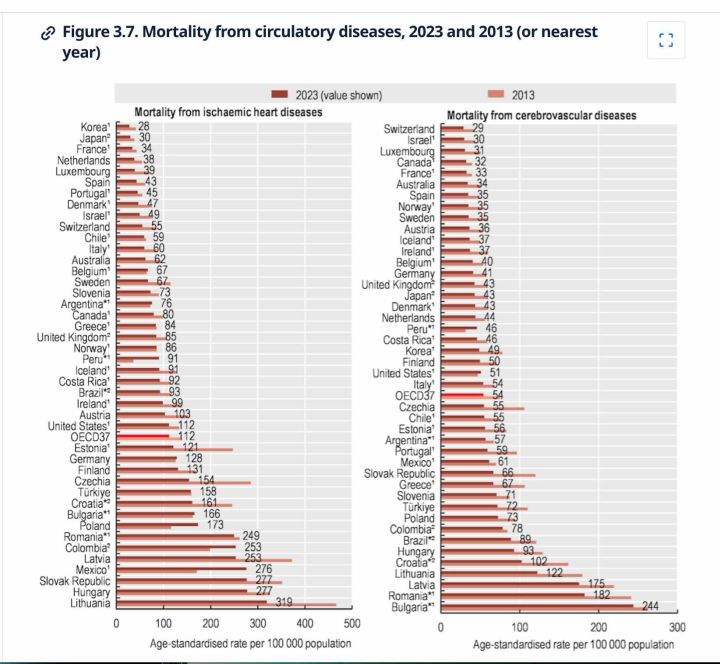 Болестите на кръвообращението са главната причина за смъртност в множеството страни от Организацията за икономическо сътрудничество и раз през 2023 година, представлявайки 28% от всички смъртни случаи в страните от Организацията за икономическо сътрудничество и раз. Преобладаващата причина за гибел измежду тях са исхемичните заболявания на сърцето и мозъчносъдовите болести, свързани са висок холестерол и диабет, нездравословни хранителни привички и ниска физическа интензивност.