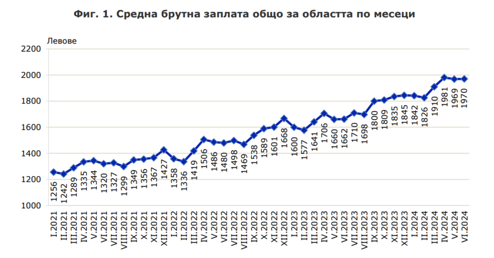 През второто тримесечие на 2024 година междинната месечна работна заплата нараства с 17,7 на 100 по отношение на същия интервал на 2023 година, като най-голямо е нарастването в " Култура, спорт и развлечения ", " Финансови и застрахователни действия " и " Селско, горско и рибно стопанство ". Най-високо средномесечно трудово заплащане през второто тримесечие на 2024 година са получили наетите лица по трудово и служебно правно отношение в икономическите действия " Създаване и разпространяване на информация и креативен продукти; далекосъобщения " - 4189 лева, " Производство и систематизиране на електрическа и топлинна сила и на газообразни горива " - 3039 лева и " Хуманно опазване на здравето и обществена работа " - 2528 лв.. Най-нископлатени са били наетите лица в икономическите действия " Административни и спомагателни действия " - 1258 лева, " Хотелиерство и ресторантьорство " - 1369 лева и " Други действия " - 1390 лв..