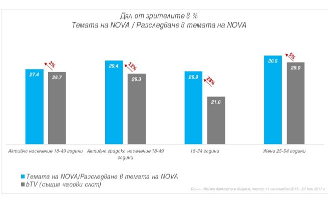 Резултатите демонстрират, че в края на всяка седмица над една четвърт от дейното население (18-49), както и по-младата публика на възраст 18-34 избират публицистиката на NOVA в лицето на Темата на NOVA.
