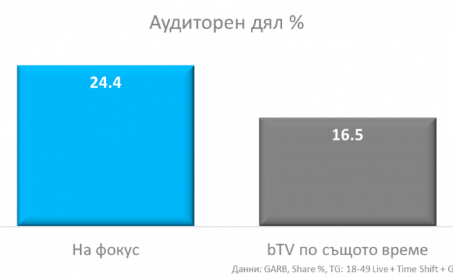 С фрапантно по-висок резултат, „ На фокус с Лора Крумова “ съумява да преодолее конкуренцията както на одобрени заглавия, предавани от години в този час, по този начин и на други започващи планове. Според формалните данни, постигнатият аудиторен дял от 24,4% измежду феновете в дейна възраст (18-49 г.), е освен най-високият измежду всички малките екрани в България по това време, само че и с голяма разлика пред главните съперници.