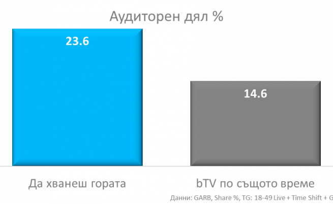 С голяма преднина пред втората по гледаемост телевизия, документалната поредност „ Да хванеш гората “ също направи своя дебют през вчерашния ден. Новото предаване на NOVA е безапелационният избор на феновете в дейна възраст (18-49 г.) с аудиторен дял от 23,6%.