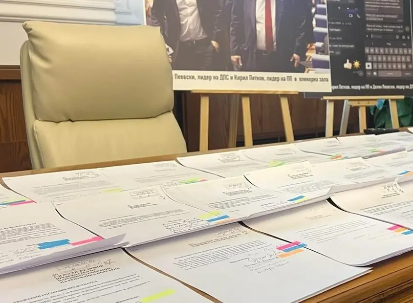 Лидерът Делян Пеевски предложения публицистите в стаята на партията, където бяха подредени фотоси и документи от взаимната работа на Движение за права и свободи ПП-ДБ по време на кабинета “Денков-Габриел ”.