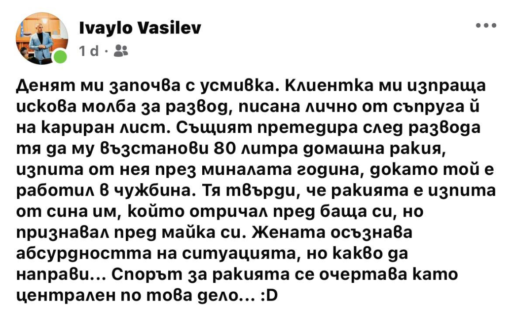 „ Д енят ми стартира с усмивка. Клиентка ми изпраща искова молба за бракоразвод, писана персонално от брачна половинка й на кариран лист. Същият претедира след развода тя да му възвърне 80 литра домашна ракия, изпита от нея през предходната година, до момента в който той е работил в чужбина. Тя твърди, че ракията е изпита от сина им, който отричал пред татко си, само че признавал пред майка си. Жената осъзнава глупостта на обстановката, само че какво да направи... Спорът за ракията се обрисува като централен по това дело... ” Пише в профила си юрист Василев.