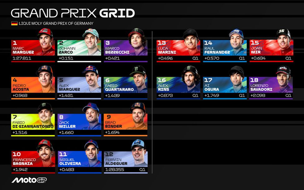 Пилотът на Дукати ще започва от полпозишъна, а до него на първата редица ще се наредят Йоан Зарко и Марко Бедзеки, който беше доста покрай успеха в спринта през вчерашния ден, само че тя му беше отнета от Маркес при започване на последната обиколка. Вторият ред, след отдръпването на Франко Морбидели, ще разделят Педро Акоста, Алекс Маркес и Фабио Куартараро, а на третата редица ще се наредят Фабио Ди Джанантонио, Джак Милър и Брад Биндър.