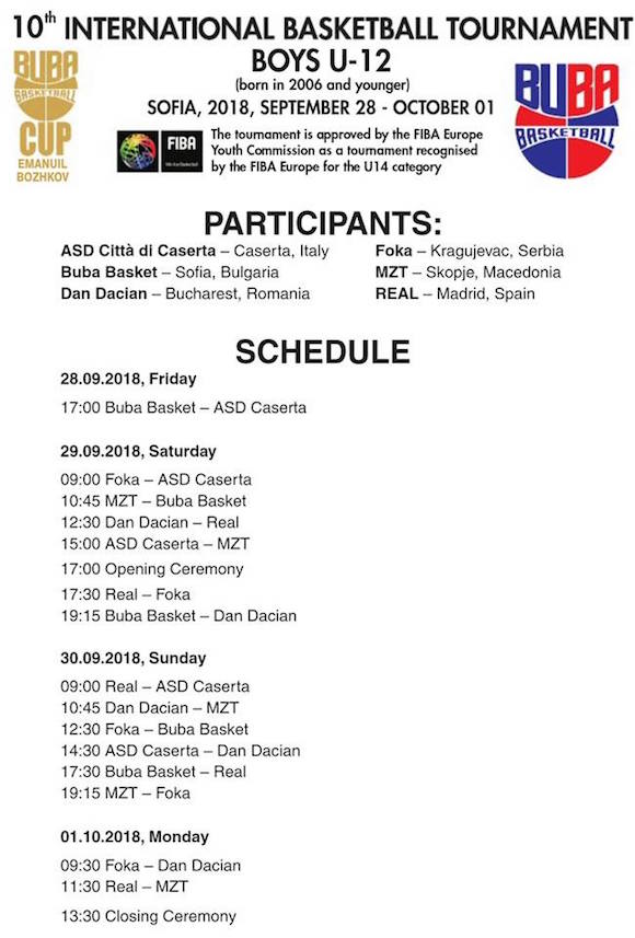 С мач сред БУБА Баскетбол и италианския Казерта ще бъде открит 10-ят юбилеен шампионат БУБА Къп " Емануил Божков ". Ежегодната конкуренция за момчета U12 ще се играе в зала " Триадица ". Освен домакините от БУБА и испанските посетители от Реал Мадрид, в надпреварата ще вземат участие още първенците на Румъния от Дан Дачиян, вицешампионите на Македония МЗТ Скопие и първенецът на централна Сърбия Фока Крагуевац. Фока е и миналогодишният първенец от БУБА Къп.