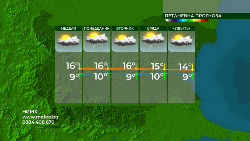 В неделя в равнинната част от страната ще бъде облачно и мъгливо, като усъвършенстване на видимостта и скъсване на ниската облачност ще настава в следобедните часове. В по-голямата част от страната минималните температури ще бъдат сред 5° и 10°, а оптималните – сред 15° и 20°, по-ниски в регионите с по-трайни мъгли. Предимно слънчево ще бъде времето в планините и планинските региони, където температурите ще се покачат.