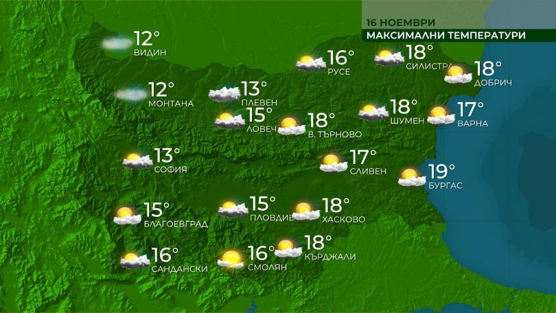 С мъгли и ниска облачност стартира съботният ден в по-голямата част от страната, само че в следобедните часове видимостта краткотрайно ще се усъвършенства, облачността ще намалее и в доста региони от страната ще бъде слънчево. Минималните температури ще са от 2° тук-там във високите полета на Западна България до 15° на морския бряг, оптималните - сред 13° и 18°, по-ниски в регионите с трайни мъгли. В планините ще доминира слънчево време с раздрана висока облачност. В подножията до обяд ще бъде мъгливо. Ще духа слаб южен вятър. Максимална температура на 1200 м – към 13°, на 2000 м – към 8°.