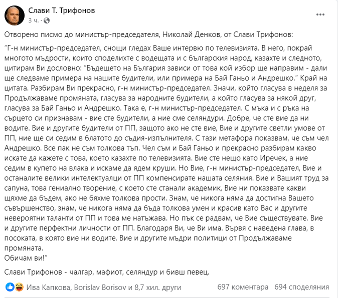 С тези думи Слави Трифонов се обърна към премиера Николай Денков в отворено писмо, което публикува във фейсбук.