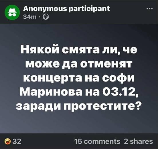 С наближаването на 3 декември, доста почитатели на Софи Маринова показаха терзание, че поради всеобщите митинги в София и в страната - против новия бюджет за 2026 година, концертът на ромската перла може да бъде анулиран. В обществените мрежи попълзяха клюки и въпроси: „ Ще се състои ли шоуто или митингите ще провалят всичко? “