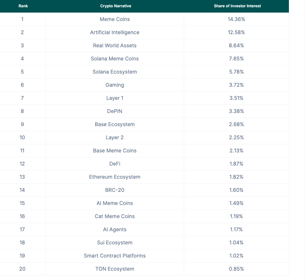 В отчета се акцентира, че с изключение на меме плановете, AI токените и Real World Asset (RWA) монетите също са привлекли доста внимание. Особено се откроиха меме криптовалутите, основани на Solana и на тематика котки, както и токените, основани на Base.