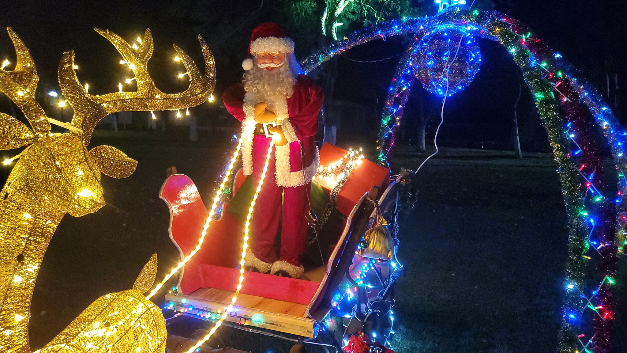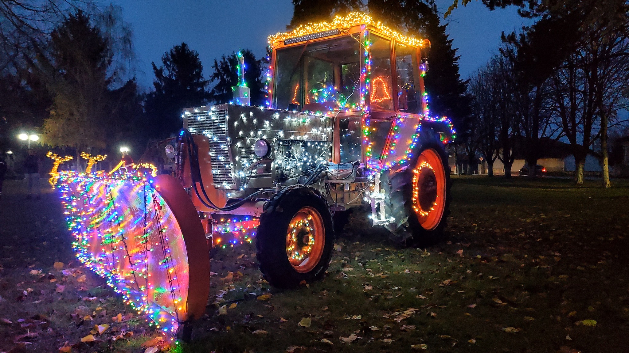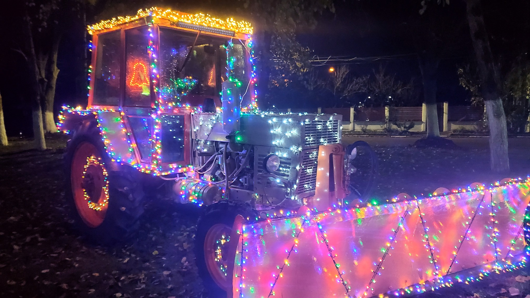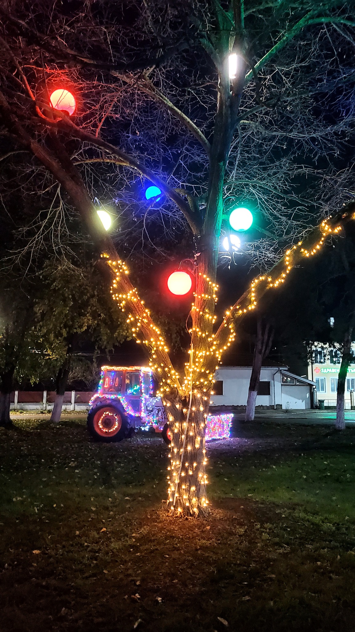 На фрагментите можете да видите както класическите детайли за декорацията на празника - елха, шейна и Дядо Коледа, по този начин и ексцентричните покрити със светещите лампички - бунар и трактор.
