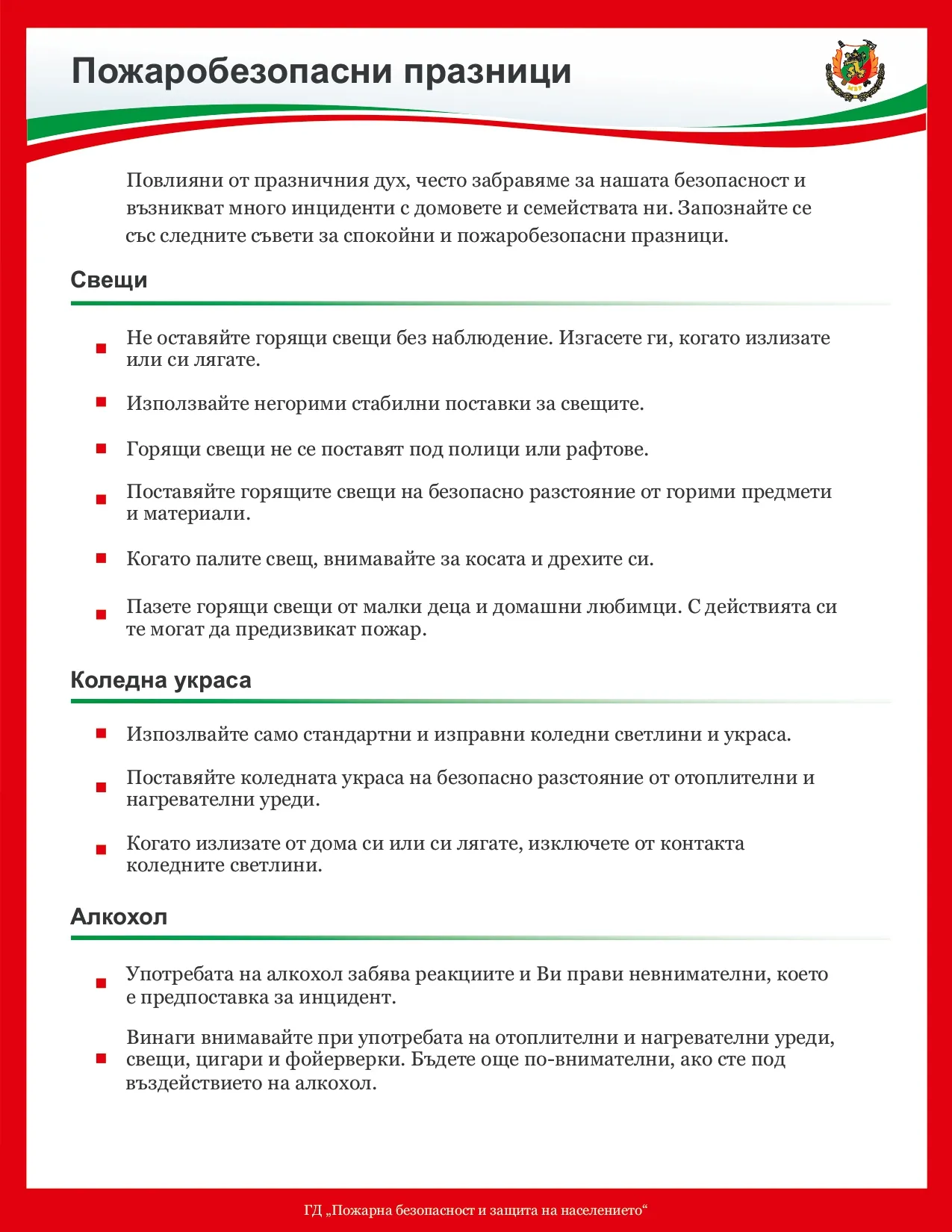 С настъпването на най-светлите и предстоящи празници в годината – Бъдни вечер, Коледа и Нова година – домовете ни се изпълват с уют, светлини, мирис на домашно приготвена храна и празнично въодушевление. Именно в тези дни обаче, увлечени от страстта и подготовката, постоянно подценяваме рисковете, които крият свещите, електрическите украси, отоплителните уреди и пиротехническите произведения.